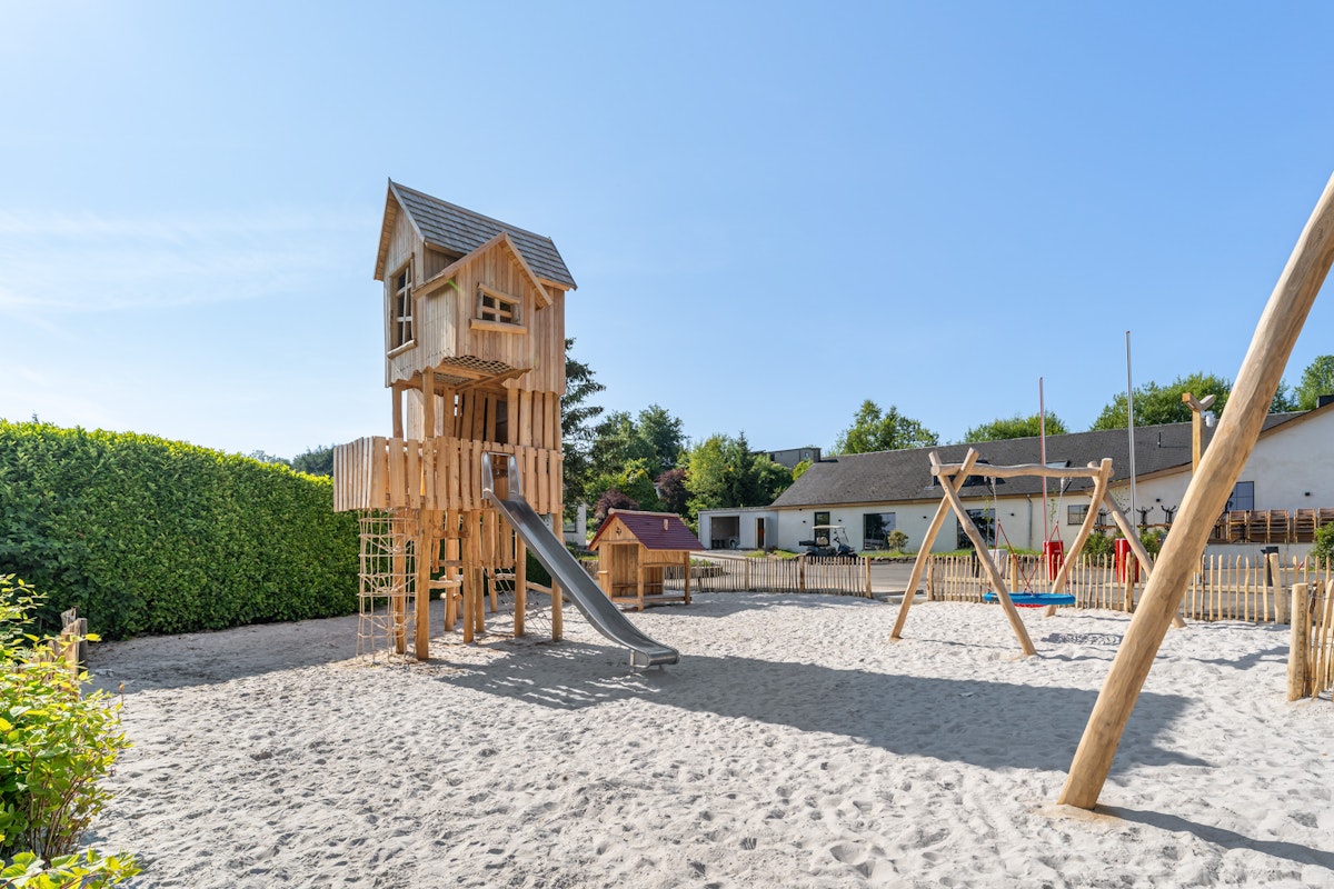 De buitenspeeltuin, gelegen tegenover de bistro, biedt een avontuurlijke en veilige omgeving voor kinderen. Het hoogtepunt is de uitkijktoren, die een spectaculair uitzicht over Bouillon biedt!